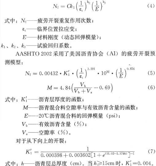 5.4.4 疲劳开裂是沥青混凝土路面破坏的主要形式。已有研究认为,重复荷载引起拉应力和剪应力,开裂首先出现在临界拉应变和拉应力发生处。临界拉应变的大小和位置取决于路面的刚度以及荷载的构成。沥青层疲劳破坏通常是以拉应变和混合料刚度(模量)为函数的模型。疲劳模型的常用数学关系为:
