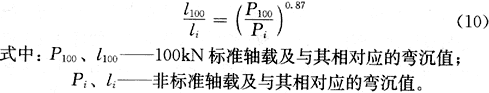 当没有BZZ-100标准车测定时,可采用其他轴载的车辆测定。若用其他非标准轴载(轴载80kN~130kN)的车辆测定时,应按照公式(10)将非标准轴载测得到弯沉值换算为标准轴载下的弯沉值。