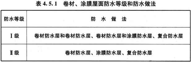 4.5.1 卷材、涂膜屋面防水等级和防水做法应符合表4.5.1的规定。