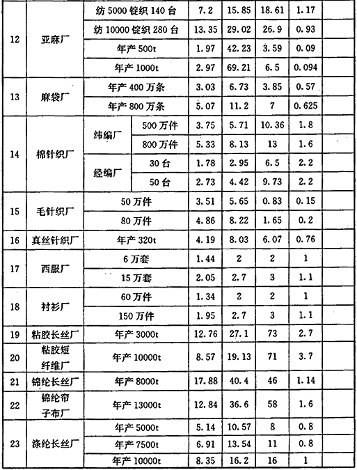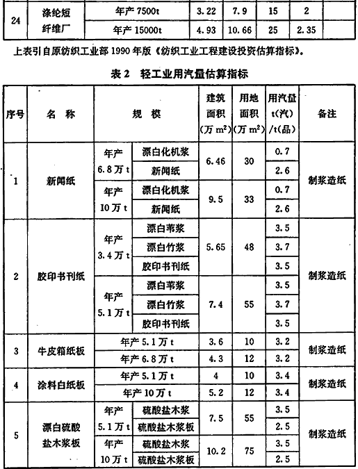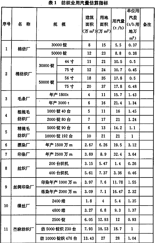 3.1.4 本条为没有工业建筑采暖、通风、空调、生活及生产工艺热负荷设计资料时,概略计算热负荷的方法。由于工业建筑和生产工艺的千差万别,难于给出类似民用建筑热指标性质的统计数据,故可采用按不同行业项目估算指标中典型生产规模进行估算(对于纺织业和轻工业可参考表1、表2)或采用相似企业的设计(实际)耗热定额估算热负荷的方法。