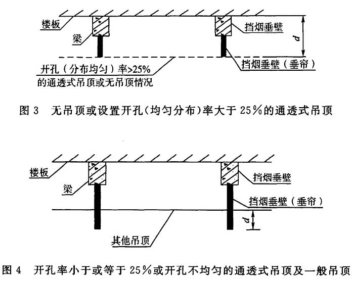 4.2.1、4.2.2 设置挡烟垂壁(垂帘)是划分防烟分区的主要措施。挡烟垂壁(垂帘)所需高度应根据建筑所需的清晰高度以及设置排烟的可开启外窗或排烟风机的量,针对区域内是否有吊顶以及吊顶方式分别进行确定,参见图3、图4。活动挡烟垂壁的性能还应符合现行行业标准《挡烟垂壁》GA 533的技术要求。