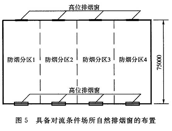 两个排烟窗应设在防烟分区短边外墙面的同一高度位置上(见图5),窗的底边应在室内2/3高度以上且应在储烟仓以内;