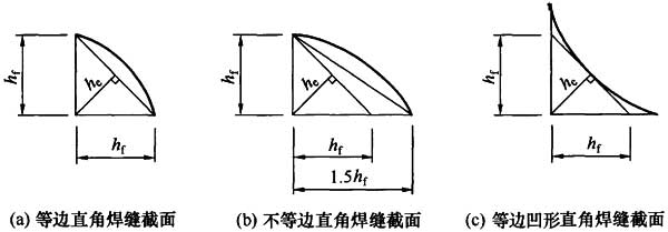 he——直角角焊缝的计算厚度(mm),当两焊件间隙b≤1.5mm时,he=0.7hf;1.5mm<b≤5mm时,he=0.7(hf—b),hf为焊脚尺寸(图11.2.2);