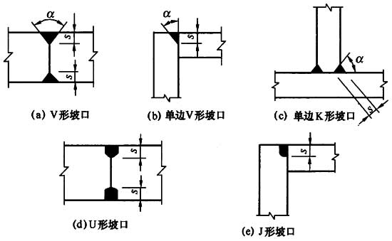 3 U形和J形坡口[图11.2.4(d)、图11.2.4(e)]:当α=45°±5°时,he=s。