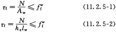 11.2.5 圆形塞焊焊缝和圆孔或槽孔内角焊缝的强度应分别按式(11.2.5-1)和式(11.2.5-2)计算: