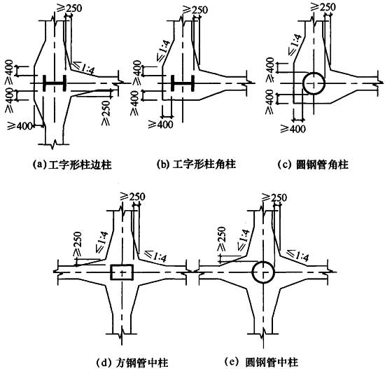 1 柱埋入部分四周设置的主筋、箍筋应根据柱脚底部弯矩和剪力按现行国家标准《混凝土结构设计规范》GB 50010计算确定,并应符合相关的构造要求。柱翼缘或管柱外边缘混凝土保护层厚度(图12.7.8)、边列柱的翼缘或管柱外边缘至基础梁端部的距离不应小于400mm,中间柱翼缘或管柱外边缘至基础梁梁边相交线的距离不应小于250mm;基础梁梁边相交线的夹角应做成钝角,其坡度不应大于1:4的斜角;在基础护筏板的边