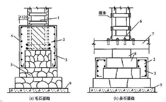 14.1.3 若原结构、构件的基础为毛石或毛条石基础(图14.1.3)或虽为砖基础,但外观质量很差,应在清理原结构构件后,增加一个加固基础的施工程序。其一般做法是在原基础上增设钢筋混凝土围套,围套内应按设计要求设置箍筋及纵向构造筋。围套应采用强度等级不低于C20的混凝土现浇而成。