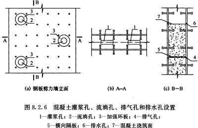 8.2.6 钢-混凝土组合剪力墙中型钢或钢板上设置的混凝土灌浆孔、流淌孔、排气孔和排水孔(图8.2.6)等应符合下列规定: