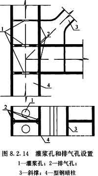 8.2.14 斜撑与墙内暗柱、暗梁相交位置应在横向加劲板上留设混凝土灌浆孔和排气孔,灌浆孔孔径不宜小于150mm,排气孔孔径不宜小于20mm(图8.2.14)。