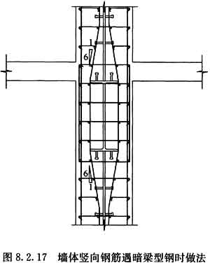 8.2.17 当墙体竖向受力钢筋遇到暗梁型钢无法正常通长时,可按1:6的角度绕开钢梁位置(图8.2.17)。