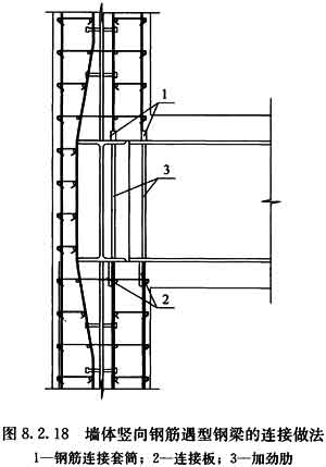 8.2.18 当墙体竖向受力钢筋遇到型钢混凝土梁无法绕开时,可采用钢筋连接套筒的连接方式连接(图8.2.18),并应符合本规范第6.2.6、6.2.7条的规定。