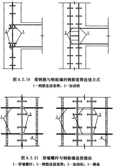 8.2.21 用于墙体模板的穿墙螺杆可开孔穿越钢板或焊接钢筋连接套筒(图8.2.21)。开孔和钢筋连接套筒的尺寸、位置应在深化设计阶段确定。