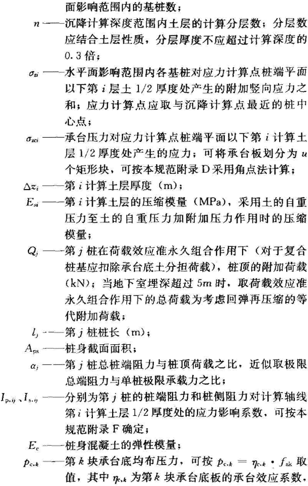 1 承台底地基土不分担荷载的桩基。桩端平面以下地基中由基桩引起的附加应力,按考虑桩径影响的明德林(Mindlin)解附录F计算确定。将沉降计算点水平面影响范围内各基桩对应力计算点产生的附加应力叠加,采用单向压缩分层总和法计算土层的沉降,并计入桩身压缩se。桩基的最终沉降量可按下列公式计算: