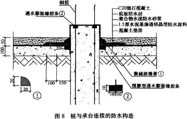 关于桩与承台连接的防水构造问题;当前工程实践中,桩与承台连接的防水构造形式繁多,有的用防水卷材将整个桩头包裹起来,致使桩与承台无连接,仅是将承台支承于桩顶;有的虽设有防水措施,但在钢筋与混凝土或底板与桩之间形成渗水通道,影响桩及底扳的耐久性。本规范建议的防水构造如图8。