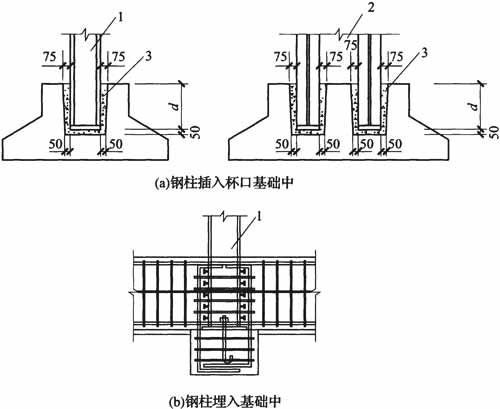 1-实腹式柱;2-格构式柱;3-杯口用细石混凝土灌实;d-柱的插入深度