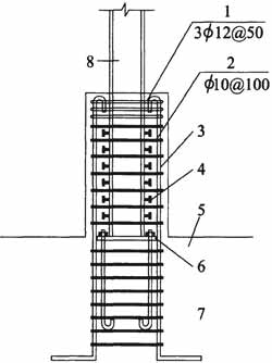 1-顶部加强箍筋;2-一般箍筋;3-垂直纵向主筋;4-圆柱头焊钉;5-基础或基础梁;6-柱脚底板;7-锚栓;8-钢柱