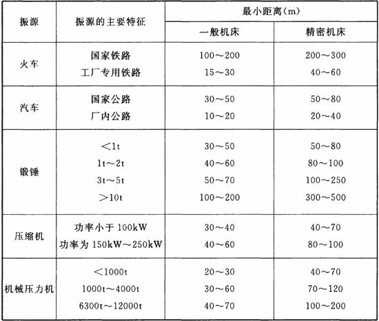 表9.1.7 厂房内机床设备与各类振源间的最小距离