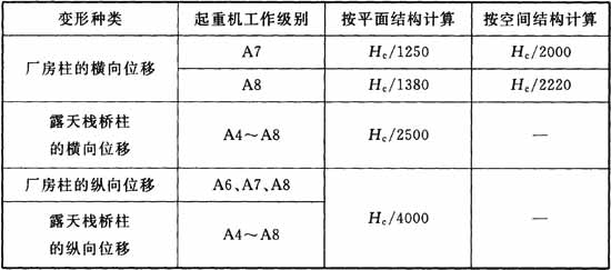 注:1 对起重量较大、起重机工作级别为A4~A6的厂房,厂房柱的横向位移宜按表中对A7工作级别的规定适当放宽;