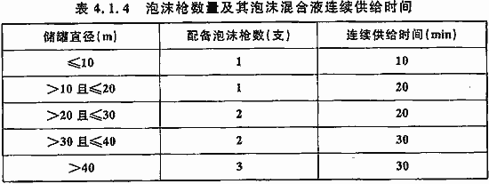 4.1.4 设置固定式泡沫灭火系统的储罐区,应配置用于扑救液体流散火灾的辅助泡沫枪,泡沫枪的数量及其泡沫混合液连续供给时间不应小于表4.1.4的规定。每支辅助泡沫枪的泡沫混合液流量不应小于240L/min。