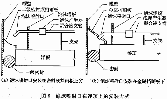 4.3.2 目前泡沫喷射口的设置方式有两种;第一种是设置在罐壁顶部,第二种是设置在浮顶上,它又分为泡沫喷射口设置在密封或挡雨板上方和泡沫喷射口设置在金属挡雨板下部(见图6)。规范表4.3.2中“密封或挡雨板上方”即指前者,“金属挡雨板下部”即指后者。