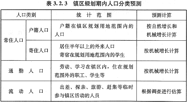 3.2.3 镇区人口的现状统计和规划预测,应按居住状况和参与社会生活的性质进行分类。镇区规划期内的人口分类预测,宜按表3.2.3的规定计算。