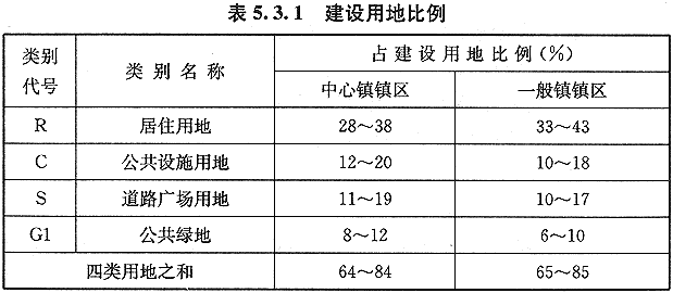 5.3.1 镇区规划中的居住、公共设施、道路广场、以及绿地中的公共绿地四类用地占建设用地的比例宜符合表5.3.1的规定。