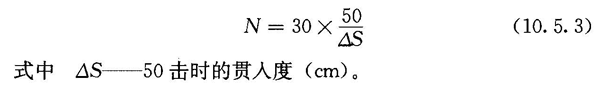 3 贯入器打入土中15cm后,开始记录每打入10cm的锤击数,累计打入30cm的锤击数为标准贯入试验锤击数N。当锤击数已达50击,而贯入深度未达30cm时,可记录50击的实际贯入深度,按下式换算成相当于30cm的标准贯入试验锤击数N,并终止试验。