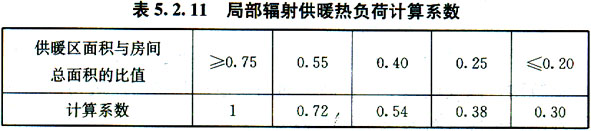 5.2.11 全面辐射供暖系统的热负荷计算时,室内设计温度应符合本规范第3.0.5条的规定。局部辐射供暖系统的热负荷按全面辐射供暖的热负荷乘以表5.2.11的计算系数。