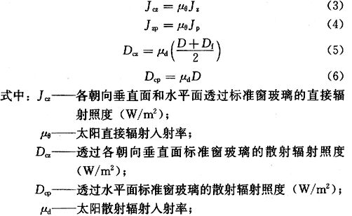 根据有关资料,将3mm厚的普通平板玻璃定义为标准玻璃。透过标准窗玻璃的太阳直接辐射照度和散射辐射照度,是按下列公式计算确定的: