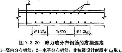 2 剪力墙竖向及水平分布钢筋采用搭接连接时(图7.2.20),一、二级剪力墙的底部加强部位,接头位置应错开,同一截面连接的钢筋数量不宜超过总数量的50%,错开净距不宜小于500mm;其他情况剪力墙的钢筋可在同一截面连接。分布钢筋的搭接长度,非抗震设计时不应小于1.2la,抗震设计时不应小于1.2laE。