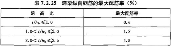 7.2.25 剪力墙结构连梁中,非抗震设计时,顶面及底面单侧纵向钢筋的最大配筋率不宜大于2.5%;抗震设计时,顶面及底面单侧纵向钢筋的最大配筋率宜符合表7.2.25的要求。如不满足,则应按实配钢筋进行连梁强剪弱弯的验算。