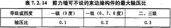 1 一、二、三级剪力墙底层墙肢底截面的轴压比大于表7.2.14的规定值时,以及部分框支剪力墙结构的剪力墙,应在底部加强部位及相邻的上一层设置约束边缘构件,约束边缘构件应符合本规程第7.2.15条的规定;