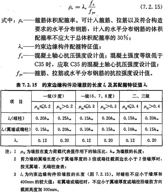 1 约束边缘构件沿墙肢的长度lc和箍筋配箍特征值λv应符合表7.2.15的要求,其体积配箍率ρv应按下式计算: