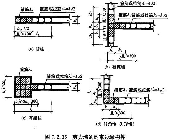 7.2.15 剪力墙的约束边缘构件可为暗柱、端柱和翼墙(图7.2.15),并应符合下列规定: