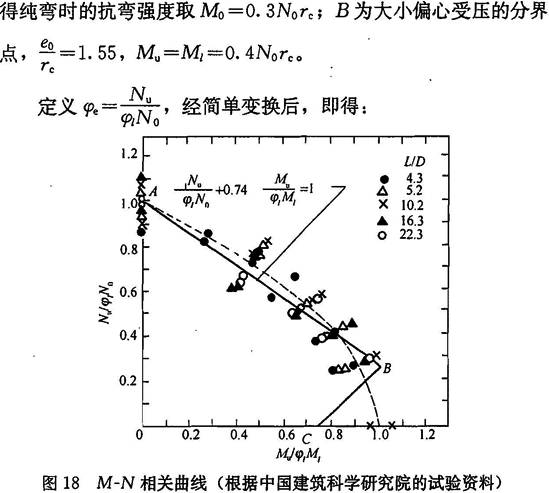 F.1.3 由极限平衡理论可知,钢管混凝土标准单元柱在轴力N和端弯矩M共同作用下的广义屈服条件,在M—N直角坐标系中是一条外凸曲线,并可足够精确地简化为两条直线AB和BC(图18)。其中A为轴心受压;C为纯弯受力状态,由试验数据
