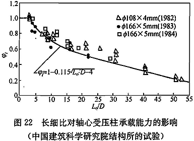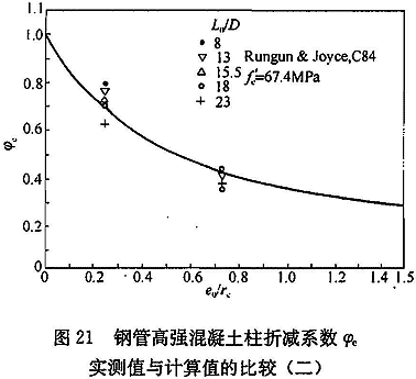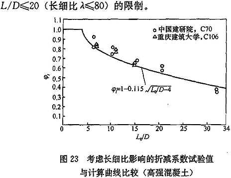 F.1.4 规程公式(F.1.4—1)是总结国内外大量试验结果(约340个)得出的经验公式。对于普通混凝土,L0/D≤50在的范围内,对于高强混凝土,在L0/D≤20的范围内,该公式的计算值与试验实测值均符合良好(图22、23)。从现有的试验数据看,钢管径厚比D/t,钢材品种以及混凝土强度等级或套箍指标等的变化,对φl值的影响无明显规律,其变化幅度都在试验结果的离散程度以内,故公式中对这些因素都不予考虑。为合理地发挥钢管混凝土抗压承载能力的优势,本规程对柱的长径比作了