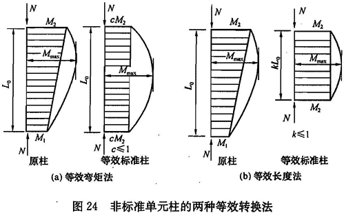 为考虑沿柱身弯矩分布梯度的影响,在实用上可采用等效标准单元柱的办法予以考虑。即将各种一次弯矩分布图不为矩形的两端铰支柱以及悬臂柱等非标准柱转换为具有相同承载力的一次弯矩分布图呈矩形的等效标准柱。我国现行国家标准《钢结构设计规范》GB 50017和国外的一些结构设计规范,例如美国ACI混凝土结构规范,采用的是等效弯矩法,即将非标准柱的较大端弯矩予以缩减,取等效弯矩系数c不大于1,相应的柱长保持不变(图24a);本规程采用的则是等效长度法,即将非标准柱的长度予以缩减,取等效长度系数k不大于1,相应的柱端较大弯矩M2保持不变(图24b)。两种处理办法的效果应该是相同的。本规程采用等效长度法,在概念上更为直观,对于在实验中观察到的双曲压弯下的零挠度点漂移现象,更易于解释。