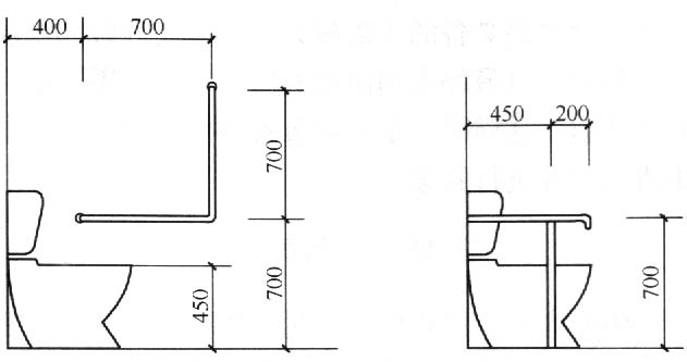 第3款 在坐便器的两侧安装安全抓杆(图3—5),供乘轮椅者从轮椅上转移到坐便器上以及拄拐杖者在起立时使用。安装在墙壁上的水平抓杆长度为700mm,安装在另一侧的水平抓杆一般为T形,这种T形水平抓杆的长度550mm~600mm,可做成固定式,也可做成悬臂式可转动的抓杆,转动的抓杆可做水平旋转90度和垂直旋转90度两种,在使用前将抓杆转到贴近墙面上,不占空间,待轮椅靠近坐便器后再将抓杆转过来,协助乘轮椅者从轮椅上转换到坐便器上。这种可旋转的水平抓杆的长度可做到600mm~700mm。