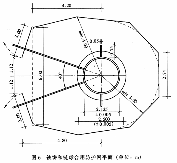 1 跳远、三级跳远、跳高、撑竿跳高如采用堆沙而不是海绵包时,应注意附注中对堆沙厚度的要求。 2 铅球、铁饼、链球、标枪项目的落地区应用宽0.05m的白色标志线加以标示,其延线应通过投掷圈圆心,标志线外有足够的安全区。 3 当铁饼和链球合用防护网时,其防护网建议尺寸见图6。