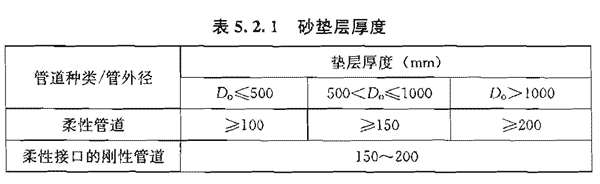 2 原状地基为岩石或坚硬土层时,管道下方应铺设砂垫层,其厚度应符合表5.2.1的规定;