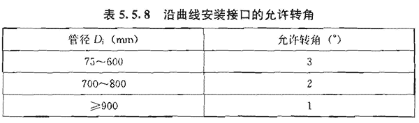 5.5.8 管道沿曲线安装时,接口的允许转角应符合表5.5.8的规定。