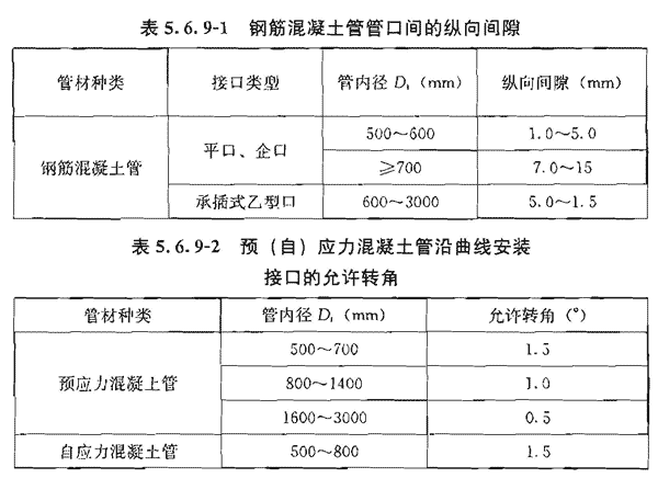 5.6.9 钢筋混凝土管沿直线安装时,管口间的纵向间隙应符合设计及产品标准要求,无明确要求时应符合表5.6.9—1的规定;预(自)应力混凝土管沿曲线安装时,管口间的纵向间隙最小处不得小于5mm,接口转角应符合表5.6.9—2的规定。