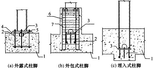 8.6.1 钢柱柱脚包括外露式柱脚、外包式柱脚和埋入式柱脚三类(图8.6.1-1)。抗震设计时,宜优先采用埋入式;外包式柱脚可在有地下室的高层民用建筑中采用。各类柱脚均应进行受压、受弯、受剪承载力计算,其轴力、弯矩、剪力的设计值取钢柱底部的相应设计值。各类柱脚构造应分别符合下列规定: