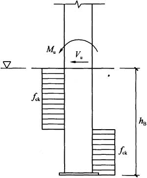 2 抗震设计时,在基础顶面处柱可能出现塑性铰的柱脚应按埋入部分钢柱侧向应力分布(图8.6.4-1)验算在轴力和弯矩作用下基础混凝土的侧向抗弯极限承载力。埋入式柱脚的极限受弯承载力不应小于钢柱全塑性抗弯承载力;与极限受弯承载力对应的剪力不应大于钢柱的全塑性抗剪承载力,应按下列公式验算: