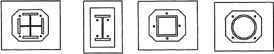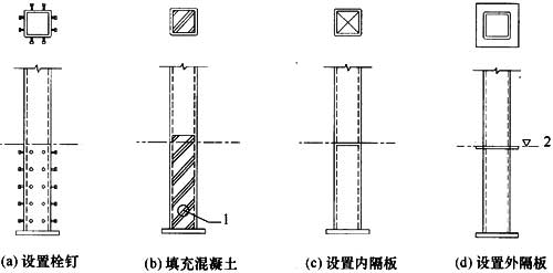 1)截面宽厚比或径厚比较大的箱形柱和圆管柱,其埋入部分应采取措施防止在混凝土侧压力下被压坏。常用方法是填充混凝土(图8.6.4-2b);或在基础顶面附近设置内隔板或外隔板(图8.6.4-2c、d)。