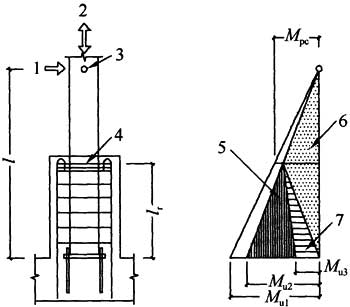 1-剪力;2-轴力;3-柱的反弯点;4-最上部箍筋;5-外包钢筋混凝土的弯矩;6-钢柱的弯矩;7-作为外露式柱脚的弯矩