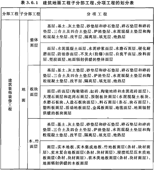 3.0.1 建筑地面工程子分部工程、分项工程的划分应按表3.0.1的规定执行。