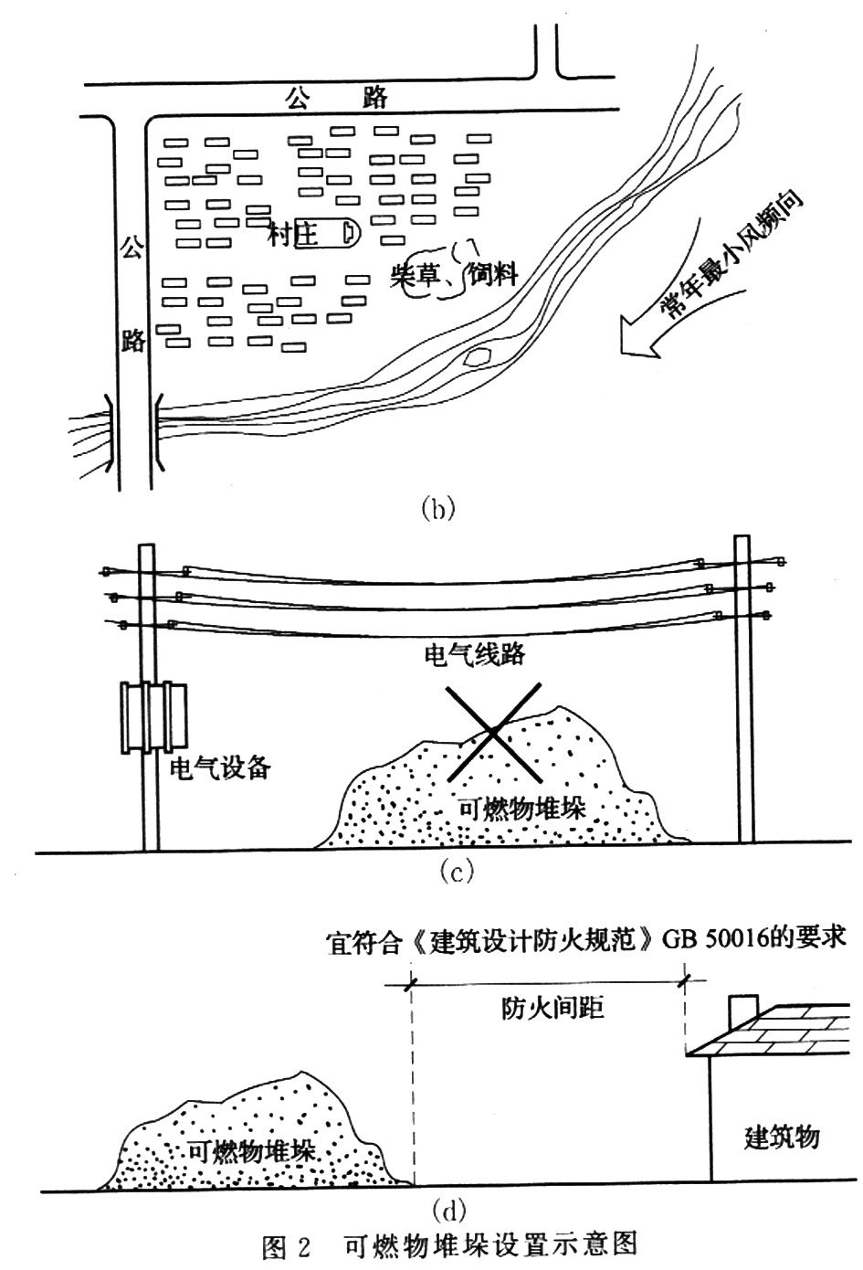 3.0.8 据统计,农村的粮食、棉花、木材、柴草等堆场发生的火灾占农村火灾总数的29.4%,柴草、饲草垛起火后燃烧快、火势猛、蔓延迅速、扑救困难,为了保障安全,作出了本条要求。较大堆垛宜设置在全年最小频率风向的上风侧,主要是考虑堆垛发生火灾时减小对居民区的火灾蔓延,保证居民安全;村民院落内堆放的少量柴草、饲料等与建筑之间应留出适当的防火间距,或采取必要防火隔离措施。