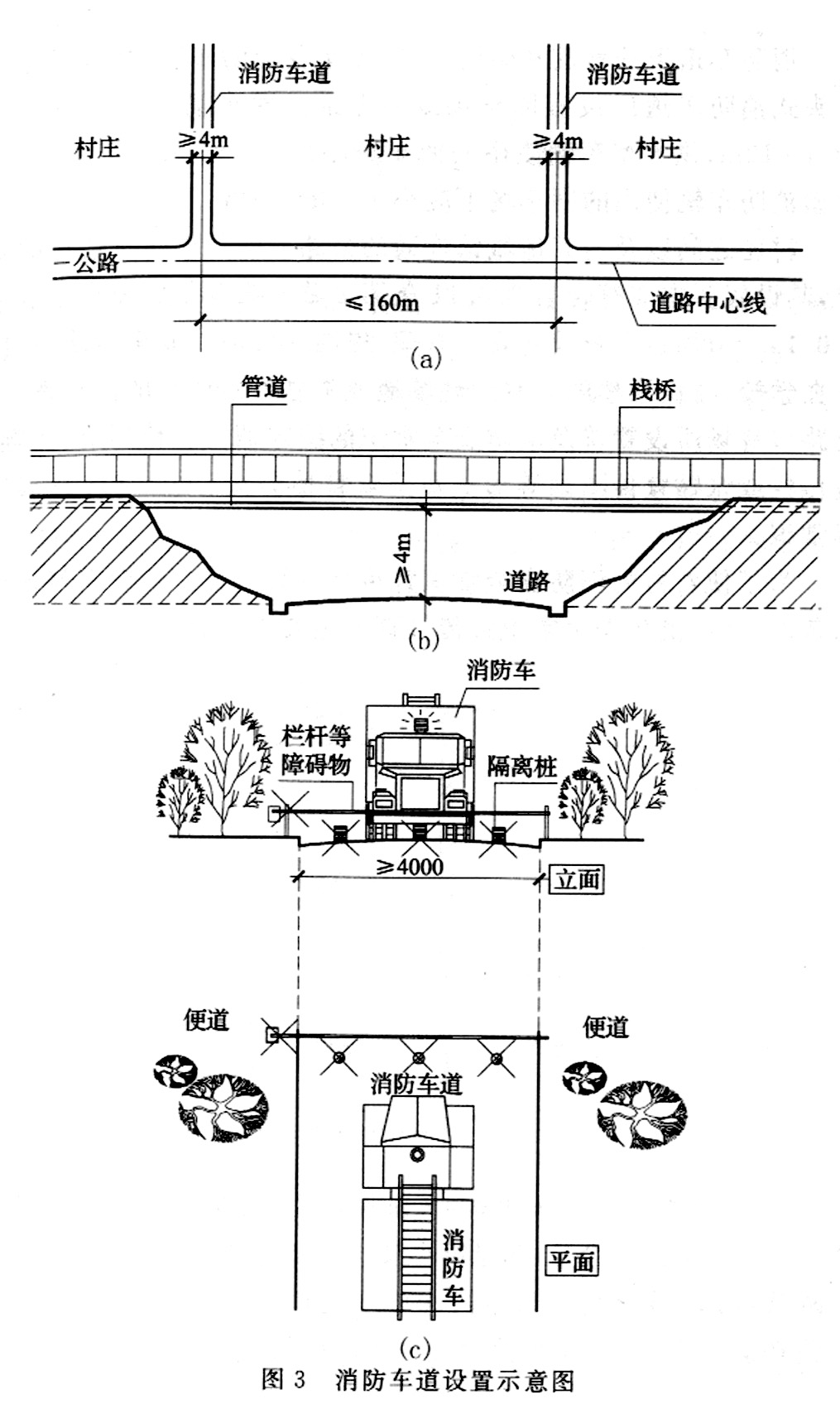3.0.11~3.0.13 规定了消防车道设置的有关要求,如图3所示。