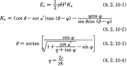 6.2.10 当边坡的坡面为倾斜、坡顶水平、无超载时(图6.2.10),土压力的合力可按下列公式计算,边坡破坏时的平面破裂角可按公式(6.2.10-3)计算:
